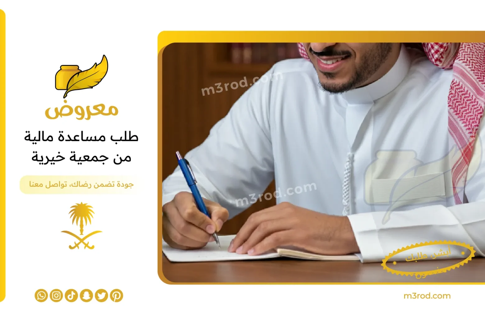 إذا كان لديك صعوبة في صياغة طلب المساعدة المالية أو تقديم على الجمعيه الخيريه أو تحتاج إلى المساعدة في إعداد الطلب بشكل مؤثر واحترافي، فإن موقع معروض يقدم لك خدمة كتابة الطلبات والخطابات والمعاريض. يمكنك التواصل معنا علي الواتساب للحصول على الدعم في صياغة طلباتك المختلفة بسهولة وسرعة، بالإضافة إلى ضمان أن يكون الطلب مكتوبًا بشكل مؤثر يزيد من فرص قبوله.