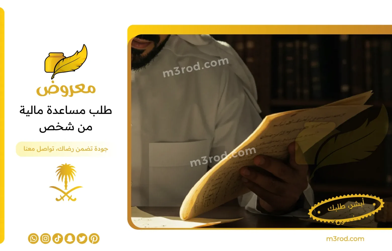 إذا كنت في حاجة لكتابة طلب مساعدة مالية إلى اي شخص أو طلب مساعدة مالية من أهل الخير، يمكنك طلب الخدمة من خلال موقع معروض نعمل على تخصيص الطلب وفقًا لاحتياجاتك، وننسق المعلومات بشكل احترافي يتناسب مع الجهة التي توجه إليها الطلب.